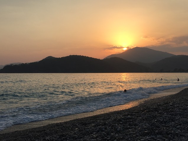 Het is iets van 8 uur als ik inderdaad weg kan en ik hoop dat ik nog op tijd ben om in Ölüdeniz bij zonsondergang een duik te nemen. De zon is om 20:20 helaas al onder maar die duik neem ik toch.