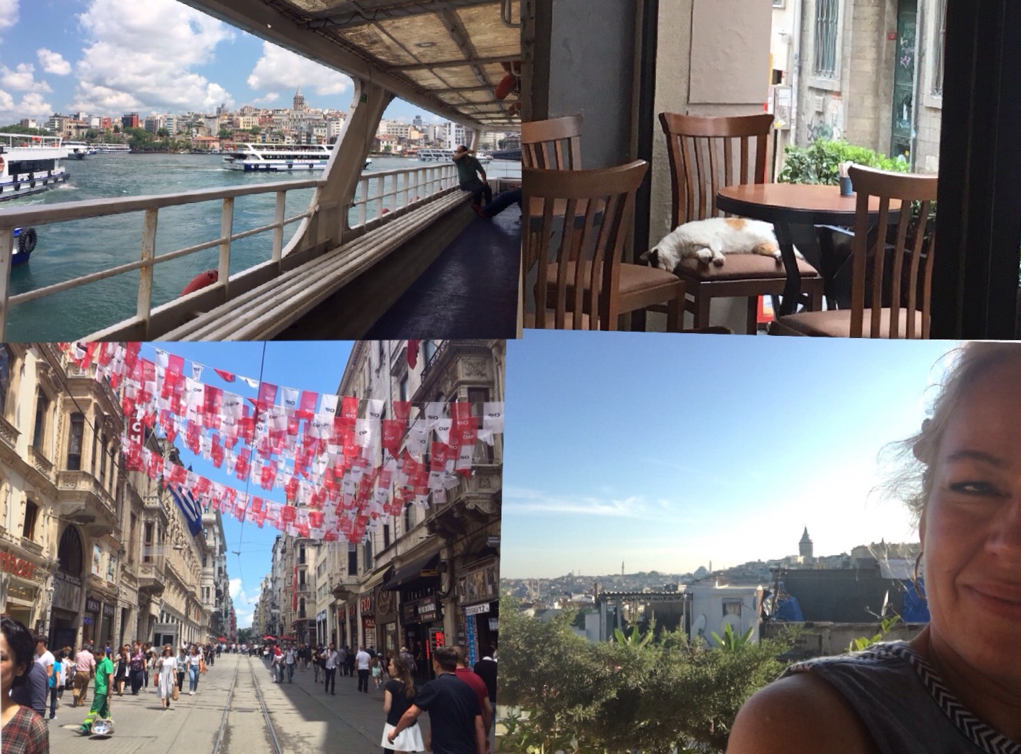 Ik vond gisteren dat ik wel mocht uitslapen dus ik had de wekker om 9:30 gezet, maar ik werd om 7:15 (6:15) al wakker. Enigszins van de schrik bekomen had ik bedacht dat ik dit maar gewoon een relaxte dag moet maken zonder ‘bucketlistgerichte’ activiteiten, aangezien ik al één taak heb vandaag, en dat is de sleutel ophalen van het appartement van Uğur (spreek uit: Oe-oer) in Cihangir, Beyoğlu. Ik moet daar om 14:00 zijn. Eigenlijk had ik nu dus de wijk in willen gaan voor een ontbijtje maar de drukte van gisteren heeft me afgeschrikt, dus ik zet gewoon koffie en smeer een paar crackers met iets van Philadelphia-achtige kaas. Ik nuttig dat ontbijt afwisselend op de ene en de andere bank en aan het tafeltje bij het raam, omdat ik mijn draai nog niet kan vinden. Al die kamers ook… wel vier, ik ben het niet gewend. De hele ochtend loop ik achter mijn spullen aan, ik vergeet direct waar ik mijn telefoon, iPad, koffie, cracker, slippers heb gelaten en moet dan dus wel vier kamers checken. Het hele ochtendritueel duurt dan ook twee keer zo lang als normaal. Maar de zon schijnt, het is warm, de ramen staan open, de geluiden van Istanbul begeleiden het hele ritueel. Om 11:30 loop ik de deur uit richting iskele (bootstation).