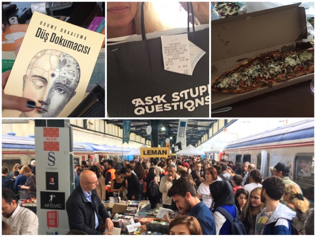 Okee, rundvee ook gezien, maar wat mijn blik trekt is een poster van de grote boekenmarkt in het Haydarpaşa station, op een kwartiertje lopen van hier. Wat moet je met Turkse boeken, zou je zeggen, maar een van mijn shopping targets is een historische atlas van Turkije, dus ik begin er maar heen te lopen. Het is wel een beetje druk op straat. Eerst denk ik dat dat komt omdat het spitsuur is bij de iskele, de haven, maar dan blijkt dat iedereen dezelfde kant op loopt als ik. Tegen de tijd dat ik bij Haydarpaşa aankom is het aansluiten geblazen. Ontzettend veel jonge mensen trouwens, studenten, scholieren en hipsters. Het doet me ontzettend goed, ik denk dat in Nederland de gemiddelde leeftijd van de bezoekers van een boekenbeurs tien jaar hoger ligt, als het niet meer is. Ongewild denk ik ook nog even aan het feit dat de omstandigheden zich prima lenen voor een bomaanslag. Jonge goddelozen en al die goddeloze boeken, de drukte is niet te overzien, je zou een prima slag kunnen slaan als het ware. En dat is nog vóórdat ik zie dat iedereen gecheckt wordt als op een vliegveld, ik moet eerst door een metaaldetector lopen, tas op de band, word dan gefouilleerd (inclusief tas), en krijg dan nog een handscanner over me heen. Komt misschien ook doordat er tientallen beroemde schrijvers aanwezig zijn die zitten te signeren, dat is natuurlijk vragen om security measures. Ik ken ze natuurlijk niet dus loop ze straal voorbij, maar er staan rijen en rijen mensen te wachten voor een handtekening in hun boek en een selfie. De boekenmarkt is uitgestald over de perrons van het voormalige treinstation Haydarpaşa, tussen de perrons staan wagons waarin je kan zitten en thee drinken. Het is gigantisch en ook al is 99,9% van de boeken in het Turks, ik pluis elke kraam na en vind het heerlijk. Ik koop een boek over de geschiedenis van Ayvalık, een notitieboek met oude foto’s en het dagboek van Anne Frank in het Turks, misschien geef ik dat wel aan Mert, de eigenaar van het apartement. Ik zie ook een exemplaar van Mein Kampf liggen, vertaald en wel (Kavgam), achteloos tussen een biografie van Atatürk en iets over Ghandi. Verschillende vertaalde Nederlandse schrijvers kom ik tegen, Mulisch, Tess Gerritsen, psycholoog Douwe Draaisma, Verloren grond van Murat Işik dat ik zo prachtig vond. Ik loop hier zeker twee uur te dwalen, nagestaard, soms vriendelijk aangesproken in de kraampjes, waar maar opvallend weinig mensen Engels blijken te spreken. Ik ben inmiddels ketskapot, ga naar huis lopen, eet het restant van het iftarbrood, en ga schrijven. Daar ga ik veel te lang mee door, ook met wijn drinken trouwens, en het is 2:00 voordat ik het licht uit doe.