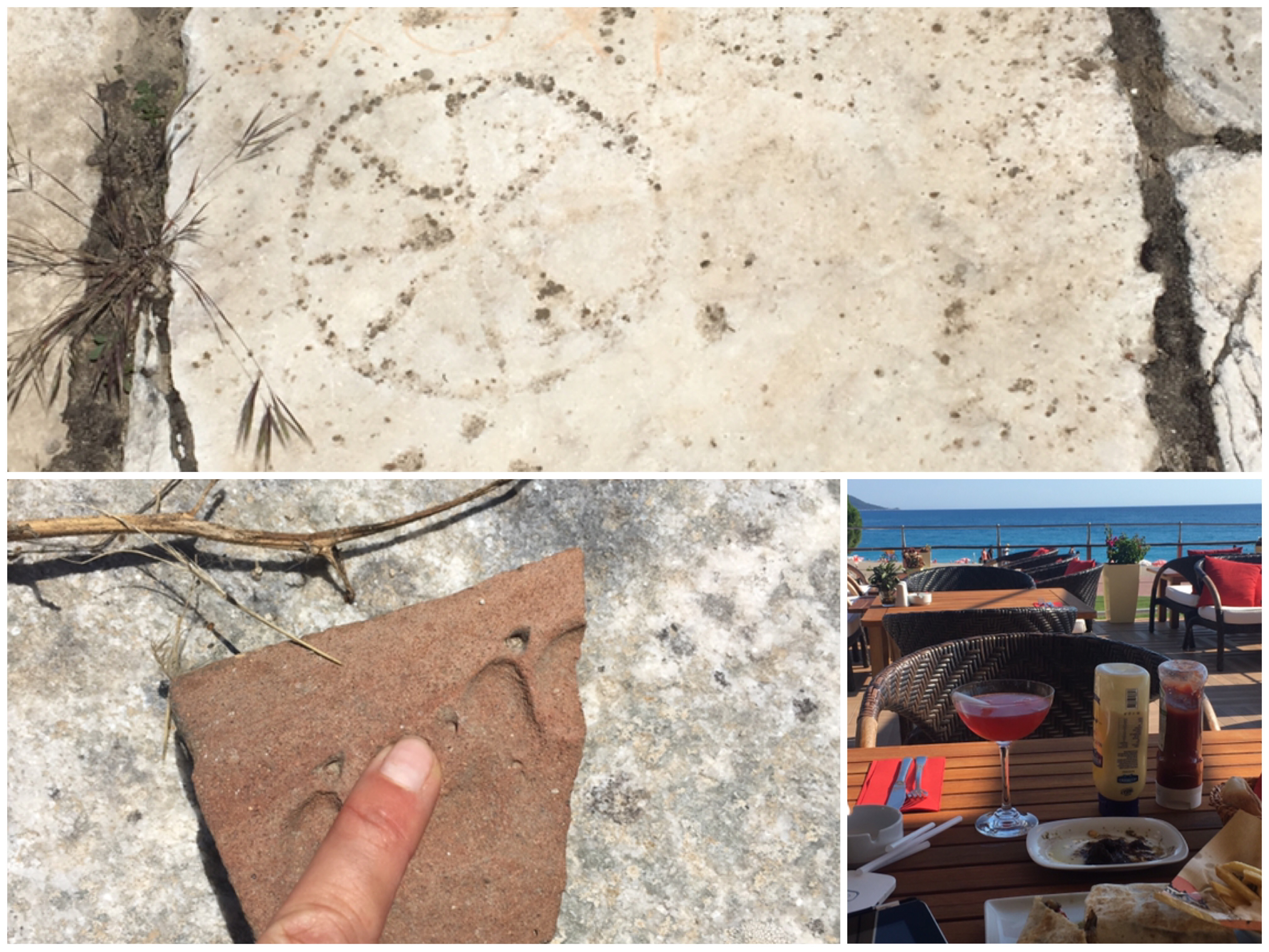 Intussen heb ik ook nog het eiland boven Fethiye rondgereden, genoten van het uitzicht op de stad en daar een heerlijk stijlvol beachclubje ontdekt waar ik heerlijk heb gesnorkeld en een klein fortuin heb uitgegeven aan bedje en parasol, een paar cosmopolitans en pizza, waarna ik lang, bijna tot zonsondergang moest wachten voordat ik in staat was om over de onverharde kronkelige weg terug te rijden. Ook ging ik op een dag naar Stratonikeia, twee en een half uur rijden over die fijne D400, bij Muğla linksaf, ik lijk wel gek. Na die paar dagen hete loomheid was het moeilijk om op tijd uit bed en op gang te komen, maar om een uur of 11 vertrok ik, en toen ik na Fethiye eindelijk de karayol opdraaide, maakte zich ineens weer het roadtrip-gevoel van me meester, met de auto op weg, verder en verder, vrij en blij naar onbekende dingen. Ik was laat, dus besloot deze keer geen lifters mee te nemen wat ik zo tien keer had kunnen doen onderweg. Ik heb het afgelopen half jaar goed bestudeerd waar het zou moeten zijn en ik had google maps bij de hand. De afslag naar Stratonikeia stond 10 meter van te voren aangegeven, een ondenkbare afslag vanaf de snelweg rechtsreeks het met stenen bezaaide zandpad op in een haakse bocht, waar ik dus bijna uitvloog. Maar goed, ik was er eindelijk, en ooo jeeeeee, wat is dit?! Het weggetje werd almaar onbegaanbaarder en met grotere stenen die in de weg lagen maar ik zag een ingestort huisje waarvan de muren duidelijk half waren opgetrokken uit marmeren blokken en stukken pilaar, en toen nog eens en nog een, ooooo jongens, ik heb de jackpot! Na nog een paar bochten zie ik een verzameling marmeren en granieten bouwstenen, met daarachter een grote ronde poort, waarvan de bovenkant is verdwenen, maar de zijkanten nog overeind staan. Hier zet ik mijn auto neer, pak mijn camera, tas en water, en loop er heen, zinderend van geluk. Als ik de poort heb bereikt zie ik daar achter de hoofdprijs liggen: een paar pilaren met daartussen een groot plein van witte marmeren blokken, met daarnaast lange rij rechte blokken waar de voeten van de pilaren op hebben staan. Ik ben weer eens de enige, er is weer niemand, de hitte schuurt in mijn keel en de krekels en de bijen zijn bijna het enige geluid. Ik kijk mijn ogen uit en besteed hier op het plein al een dik half uur, overal dezelfde mysterieuze tekens als ik al op andere plaatsen heb gezien, en scheefliggende blokken op de grond die het waterleidingsysteem blootleggen, en roestkleurige aardenwerk buizen die hier en daar de grond uit steken. Ik vind een stuk keramiek met vingerafdrukken erop en leg mijn eigen vinger er even in. Ik loop aan het einde van het plein het bos in, her en der staan kleine ingestorte huisjes, zonder uitzondering gebouwd met delen van de griekse en romeinse overblijfselen, die hier ook overal in het rond liggen. Ik loop terug en verken de rest van het terrein rondom het plein en de poort, en ik weet eerlijk gezegd niet goed naar welke tijd ik sta te kijken, delen van de grijs-roze oude muren bevatten stukken wit marmeren pilaar. Door de hele geschiedenis heen hebben mensen de resten van voorgaande beschavingen gebruikt om hun eigen beschaving op te bouwen, het doet een beetje pijn, maar het is toch een organisch gegeven. Deze plek is echter nog maar nauwelijks aangeraakt door de sloopgrage handen van de overheidsdienst der restaurantie- en vernachelwerken. Een paar pilaren zijn overeind gezet, er liggen wat stenen op een hoopje, maar that’s it, ooooo jeeeee ik kan mijn geluk niet op.