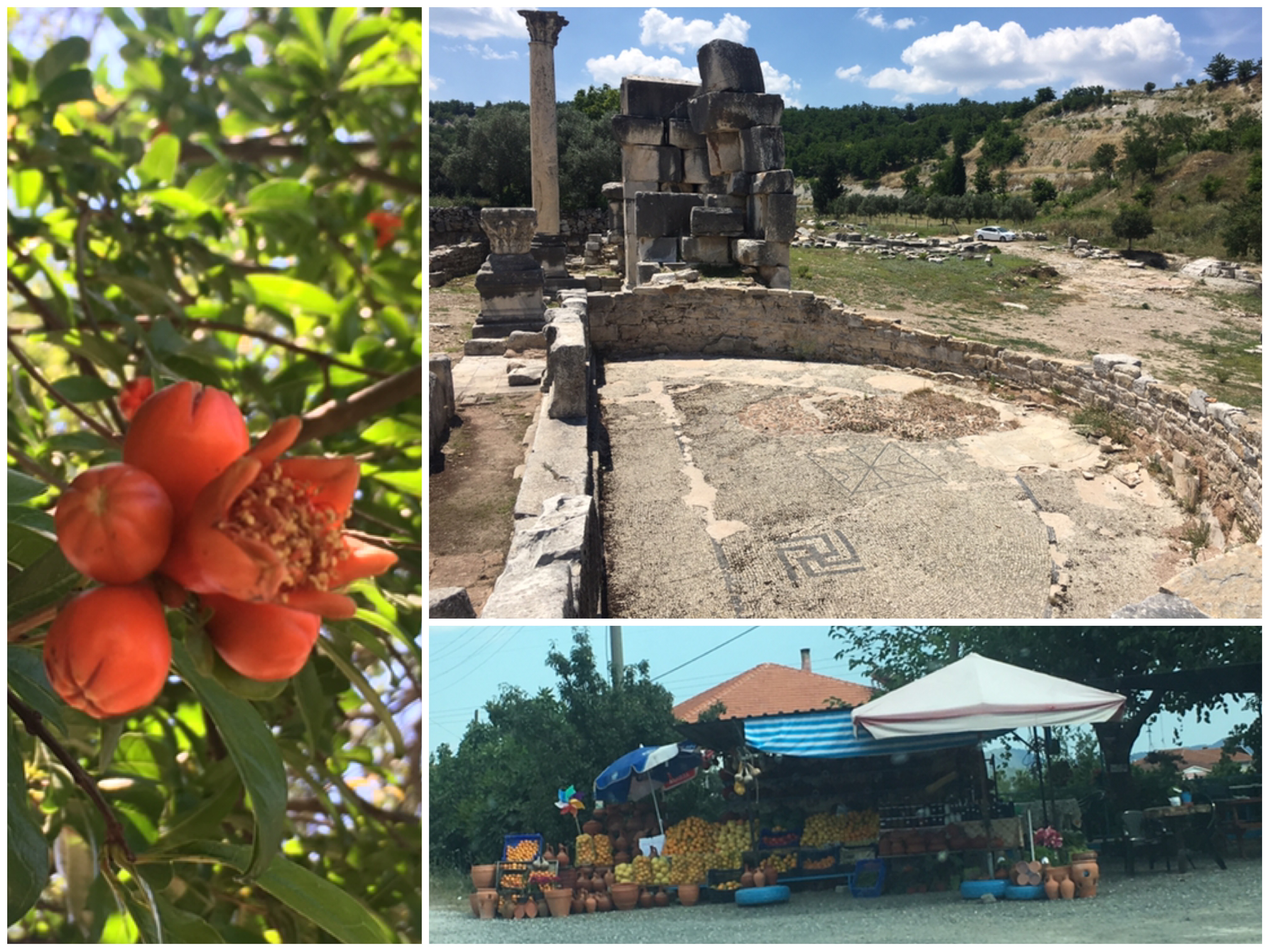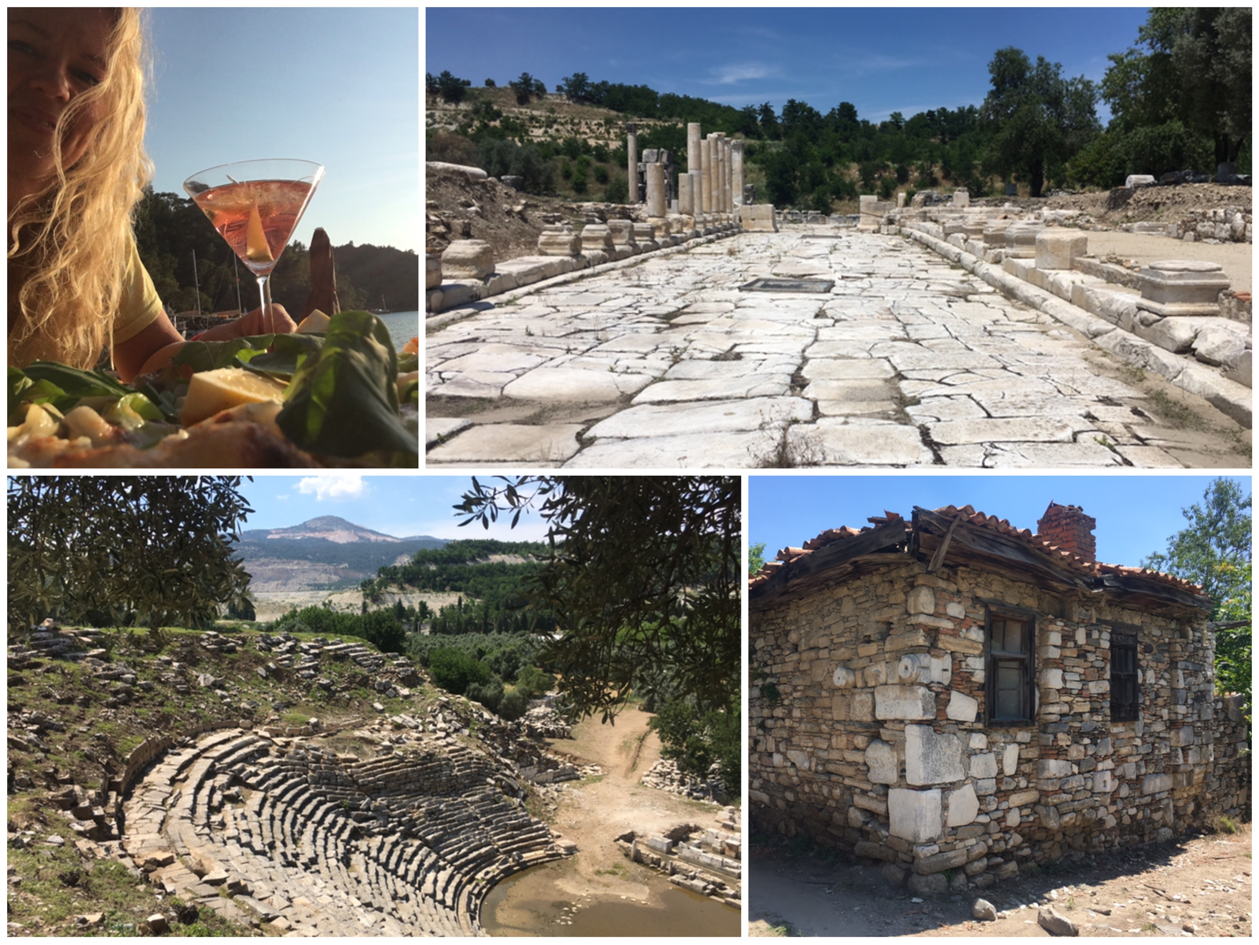 Met de auto rijd ik naar de andere kant. Ik wil alleen nog het amfitheater zien en dan weer snel naar huis. Op Google Maps had ik het amfitheater gezien, het leek me niet al te groot. Ik moest omrijden naar de provinciale weg en langs de kant van de weg stoppen, er was geen parkeerplaats. Ik stapte uit en liep de berm in die omhoog liep, ik zag alleen een soort geitenpaadje en volgde het. Bovenaan aangekomen keek ik neer op een bescheiden terrein dat bezaaid lag met blokken marmer, sommigen rommelig in het rond, anderen een beetje geordend naast elkaar. In het midden een stralend witte rechthoekige marmeren vloer van een tempel, een paar halve pilaren overeind, met daarachter een granieten weg. Deze kleine tempel en het amfitheater dateren uit de Romeinse tijd, rond het jaar 200, maar de stad zelf is al van ongeveer 400 v.C.. Als ik aan het eind van de straat kom verschijnt onder me een reusachtig amfitheater, een van de mooiste die ik heb gezien, de treden zijn verzakt en gebroken, er zitten grote gaten in. Het uitzicht over het gebied is overweldigend mooi en groen, ik vertrek zometeen al, maar ik denk dat ik hier wel een goed deel van de dag zou kunnen doorbrengen. Achteraf heb ik spijt dat ik dat niet gedaan heb. In de verte zie ik de noordelijke poort waar ik net was, en tussen daar en hier liggen verspreid over het terrein nog verschillende gebouwen waaronder het gymnasium en bouleuterion (raadsgebouw). Ik overweeg om via de krakkemikkige treden naar beneden te klimmen, maar zie nergens een veilige trede om te beginnen. Het is ook veel te heet, dus in plaats daarvan loop ik maar helemaal over de bovenste rand heen, zover ik kan. 12.000 mensen moeten hier in hebben gekund. Wat moet het druk en gezellig zijn geweest. Die voorstelling vind ik dan wel weer heel mooi, terwijl ik nu juist heel blij ben dat er geen drukte is en ik hier even in pure eenzaamheid kan zijn.