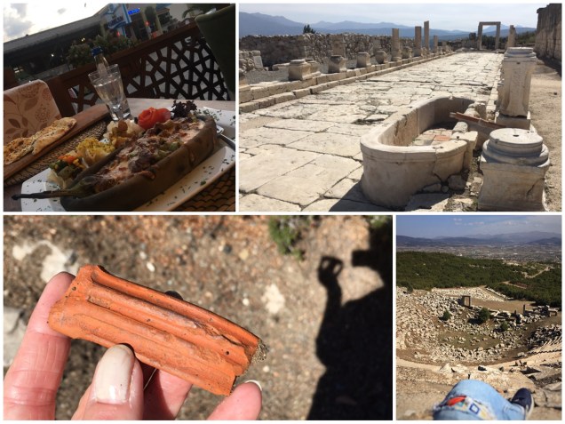 Gelukkig is het prachtig weer, helemaal geen regen, zelfs heet, dus ik lig zondag grotendeels onder de bomen op het Kidrak strand, waar het rustig is. Met mijn tatoeage gaat het prima, ik heb een paar dagen geleden het plakplastic er af getrokken, en ik smeer het afwisselend in met de ‘vegan’ creme die ik van het hipster meisje kreeg, en factor 50 zonnebrand. Ook heb ik een fles gekookt water met een beetje desinfecterende zeep erin bij me, waarmee ik hem afspoel als ik in het water ben geweest, al heb ik niet het gevoel dat dat echt nodig is, sterker nog, waarschijnlijk verpest ik er de heilzame werking van het zeewater mee, maar laat ik voor deze keer maar iemands advies opvolgen. De huid ziet er perfect uit, alsof hij nooit is aangeraakt. Ik snorkel een beetje maar er is niet veel te zien. Ik lees het fantastische Een Soort Geluk van Peter Abelsen. Ik drink een heleboel water en eet amandelen en pistachenootjes, tot ik er weer klaar mee ben en mijn rug toch wel een beetje aan het schroeien is. Ik doe niet te moeilijk met eten en stop onderweg bij bistro Belcehan, eigenlijk is het nog te vroeg om te eten maar het maakt me niet uit. Omdat ik op één Engels stel na de enige ben, word ik helaas aan de straatkant aan een tafeltje gezet en gaat de kok zich vanuit de keuken rechtstreeks met mijn bestelling bemoeien vanachter zijn uitserveerbalie vandaan. Als ik linzensoep en ‘chef’s special’ grill bestel, steekt hij lachend zijn duimen naar me op. Ik klap mijn iPad open en ga zitten schrijven, me bewust van het feit dat ik aan de doorgaande weg zit en iedereen me hier ziet. Morgen wil ik vroeg opstaan, want dan doe ik de laatste expeditie van deze vakantie, naar Kibyra in de buurt van Gölhisar, ongeveer 115 km rijden waar ik dik twee uur over zou moeten doen.