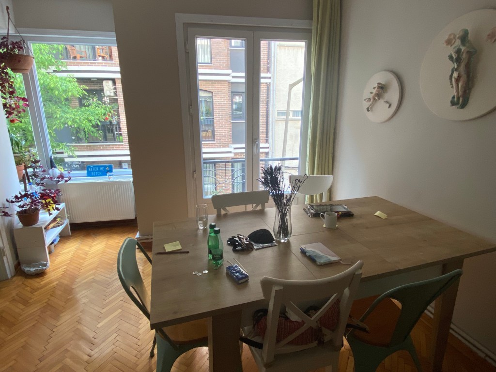 Voor de deur van het Aral gebouw zet hij me af. De verhuurster reageert even niet op mijn appjes dat ik er ben. Een bewoner laat me binnen in het typische Frans aandoende jaren 50/60 gebouw met de marmeren trap en bruine ijzeren brievenbusjes tegen de muur. Ik sta in het halletje. “I’m waiting for you, where are you at?”, vraagt Özgü. “I’m here”, zeg ik, “inside your apartment building”. “I don’t see you”. Ik weet niet hoe ik nu moet uitleggen dat ik al binnen sta, in het Turks is het iets van içimdeyim denk ik, en de twijfel slaat toe of ik wel in het goede gebouw sta. Ja, toch echt wel. Dan gaat er gelukkig een deur open en laat Özgü me binnen. Ik ben zo blij. Het appartement is zo leuk. Özgü is zo lief, en klein, en dun en ‘Modalı’ dat ik al weer helemaal geïntimideerd ben. Als ze me de tour en de wificode heeft gegeven pak ik snel een tas om boodschappen te gaan doen. Het is knettterdruk op straat, vanwege de Fenerbahçe-wedstrijd vanavond en ik koop maar gelijk wat brood en kaas en koffie en wijn want moe en ik moet mijn straatvrees nog een beetje overwinnen en wil vanavond niet meer naar buiten.