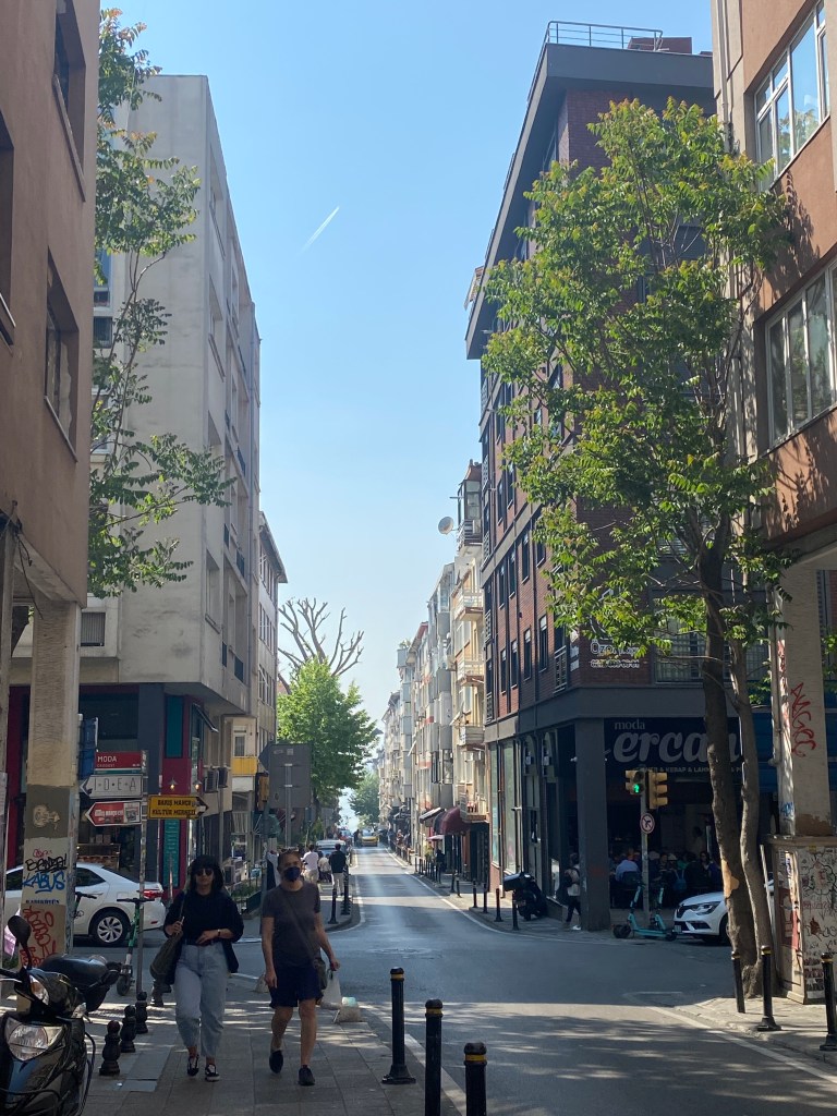 Er is op Sabiha altijd een giga-rij bij de paspoortcontrole maar hij gaat redelijk snel en ik heb al appjes gekregen van de taxichauffeur die ik natuurlijk van te voren al had geregeld bij Welcome Pickup (ik ben kennelijk de pickup, okee, beetje dubieuze naam) met foto’s van waar hij staat en hij heeft een bordje met mijn naam en zo zit ik weer in zo’n bekende Mercedes Vito met beige nep-leren bekleding en van die kitscherige blauwe ledlampjes in het plafond waardoor je overdag toch van een sterrenhemel kan genieten. Als we Moda binnenrijden krijg ik dat ‘intense geluksgevoel’ en moet ik diep zuchten. Als we langs de iskele rijden waar ik net een paar maanden terug met Nathalie liep, krijg ik een dikke grijns op mijn gezicht, ik voel me helemaal licht, en het voelt alsof ik hier alle tijd van de wereld heb, dat het nu klaar is, wat natuurlijk geenszins het geval is.