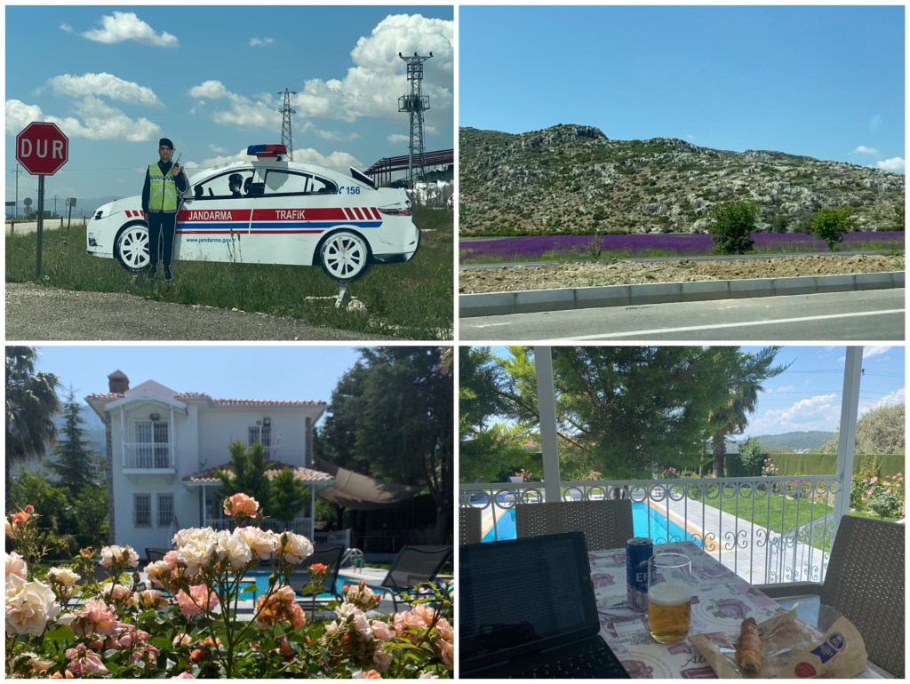 Joehoe wat ben ik weer lekker vroeg wakker en helemaal blij want vandaag naar eindbestemming waar ik alle stress hopelijk kan laten varen en alleen maar aan het strand en bij het zwembad ga liggen. Bij een klein tekeltje in het dorp haal ik nog wat water en pufs en zakdoekjes want chronische loopneus, achter de toonbank staat een dame die alleraardigst naar me glimlacht en vraagt naar mijn ‘memleket’. “Hollandalıyım”, zeg ik en ze wil vanalles weten wat ik hier komt doen en waarom ik een paar woorden Turks spreek. Ik stap weer in de auto en ga de snelweg op, nee ik ga niet meer terug naar Sagalassos bij zonsopgang wat ik eigenlijk wilde doen (grappig hoe, als je het een keer hebt gezien en dat grote verlangen is gestild, je het onderwerp van dat verlangen dan in de werkelijkheid ineens heel anders gaat zien, gewóón, alsof het ineens van zijn voetstuk valt. ‘Het bezit van de zaak is het eind van het vermaak’, zei mijn vader altijd, en zo is het ook hiermee), en ook niet naar het lonkende museum van Burdur, ik ruik mijn nest en ik moet nog 3,5 uur rijden. Daar zie ik helemáál niet tegenop, in tegendeel, ik ga er lekker van genieten en onderweg ergens koffie drinken. Om de zoveel kilometer staat er in dit land langs de snelweg een levensgroot foambord met een foto van een politieagent erop met een walkietalkie in zijn hand, of een politieauto met een agent erin met een walkietalkie in zijn hand, of een combinatie van de twee. Ze lijken bestwel echt, als je aan komt rijden. Het helpt geen ene moer natuurlijk. Maar het is wel grappig. Ik stop toch even om er een foto van te maken. Ik moet nu eerst weer een heel eind borden Antalya volgen en daarna splitst de weg zich naar de Burdur-Fethiye yolu en die is weer een feest van herkenning, en zo mooi. Bergen, en velden met paarse bloemen, fruitbomen en graan.