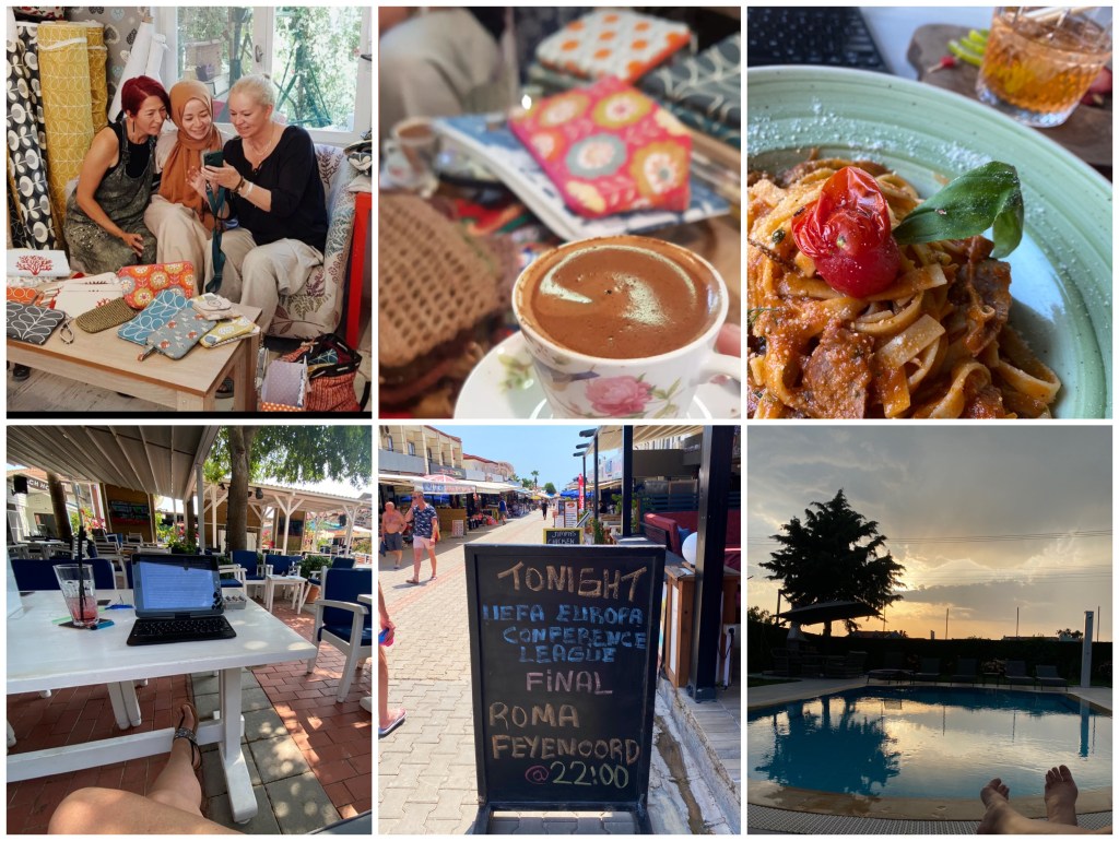 Maar afijn, waar was ik. Ik had de kussens van het andere tweepersoonsbed, waar mijn koffers op lagen, naar mijn bed gesleept in de roze kamer, die niet aan de straatkant ligt maar aan de wat rustigere zijkant. Man man man wat slaap ik heerlijk met vier kussens net als thuis. Ik heb al weer helemaal geen zin om eruit te komen en te bewegen, maar ik moet wel want om 12:00 moet ik weer bij Ayşe in Fethiye zijn. Dat is maar 15 minuten rijden maar er gaat een heleboel voorbereiding aan vooraf, want ik moet natuurlijk eerst uitgebreid wakker worden met koffie en een paar letters geschreven, bovendien moet ik netjes zijn aangekleed want Ayşe is nogal vroom in het geloof dus ik wil haar niet tegen de borst stuiten, dus lange wijde linnen broek en zwart shirtje met halflange mouwen en de haren netjes in een staart met vlecht. In Fethiye is het één grote bende. Ik weet niet wie er dacht dat het een goed idee is om vlak voor het hoogseizoen alle wegen te gaan renoveren, maar bij dezen bied ik diegene een stageplek aan bij mijn werkgever (die overigens hetzelfde doet, maar met het verschil dat in het hoogseizoen de drukte op de rijkswegen juist minder is tijdens de vakanties). Ik word tien keer omgeleid en ik weet al helemaal niet meer waar ik ben, bovendien zijn er natuurlijk nul parkeerplekken, dus ik zet hem uiteindelijk maar gewoon bij een tankstation neer, ik ga wel lopen, het is nog vroeg, lekker een ochtendwandelingetje is ook goed, dan kan ik ook meteen wat nieuwe straten in mijn geheugen opslaan. Er is zelfs nog tijd voor koffie en even videobellen met mijn moeder. Met Ayşe heb ik afgesproken bij ‘Villa Home tekstil & carpet’, een stoffenwinkel die net buiten de Paspatour markt staat, waarvan zij de stoffen gebruikt om haar tasjes te maken. Het is een superleuke kleine winkel, met o zulke leuke katoenen stoffen. Ayşe staat net op de stoep te bellen als ik aan kom, we zwaaien naar elkaar en de begroeting is al weer zo verschrikkelijk leuk en lief, de oprechte blijheid om elkaar weer te zien is gewoon ontroerend. Voor het gemak heeft ze ook een vriendin Guidem uitgenodigd die als tolk gaat optreden, want Ayşe’s engels is ongeveer net zo goed als mijn turks. Binnen maak ik ook kennis met de eigenaar, die ons voorziet van turkish coffee en lekker meedoet met het gesprek. Guidem komt zelf uit Istanbul, wat ons meteen weer een heel arsenaal aan gesprekstof geeft. Maar eerst moet ik van haar bekennen dat tulpen toch echt turks zijn, of niet? Natuurlijk zijn tulpen turks, zeg ik tegen haar. Ik vertel haar dat ik in 2017 bovenop de top van Bergama stond, samen met een Chinese man die vertelde dat hij ook in Nederland was geweest en dat zo mooi vond, met al die molens en tulpen enzo. Ik zei tegen hem: “But tulips are actually from Turkey”, waarop hij antwoordde: “Yes, but you sell them!”. We kletsen, drinken koffie bij de stapels tasjes die Ayşe heeft meegenomen en door 4 mensen worden er foto’s gemaakt, en ja van drie van hen zie ik ze allemaal weer terug op instagram, met allemaal lieve teksten erbij maar toch weer een beetje gênant. Ik ben niet zo van het posten van dingen. Ook al is het makkelijk te vinden, je hoeft maar mijn naam aan elkaar te googlen en je komt er vanzelf op, toch zijn maar weinig mensen die deze blog kennen en dat hou ik graag zo. Ik kan me nog steeds niet voorstellen dat er iets áán is om het te lezen namelijk. Het is meer een soort dagboek, alleen dan zwaar gecensureerd en afgevlakt cynisme en zonder alle depressieve negatieve gedachten. Eigenlijk een beetje zoals mijn huis, en mijn hele leven wat dat betreft, je bent welkom, maar niet onaangekondigd zomaar binnenvallen, geef me even een momentje om iets aan de chaos te doen.
